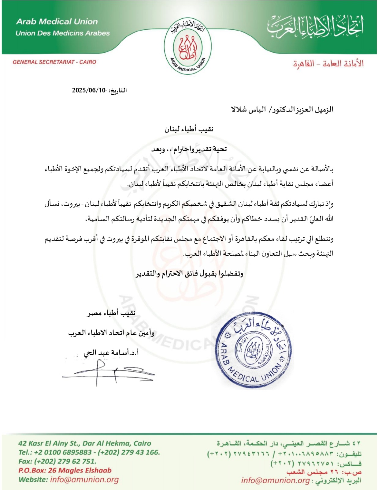 • تهنئة السيد الامين العام للدكتور / الياس شلالا واعضاء مجلس نقابة اطباء لبنان بانتخابه نقيبا لاطباء لبنان