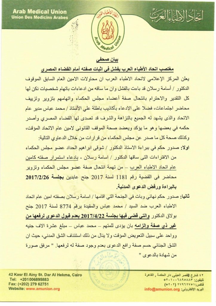 يعلن المركز الإعلامي لاتحاد الاطباء العرب ان محاولات الامين العام السابق الموقوف الدكتور / أسامة رسلان قد باءت بالفشل وان ما ساقه من ادعاءات باتهام شخصيات نكن لها كل التقدير والاحترام بانتحال صفة أعضاء مجلس الحكماء واتهامهم بتزوير وتزييف محاضر اجتماعات، فضلا على الادعاء بأكاذيب باطلة علي الأستاذ / محمد عباس مدير عام الاتحاد والذى يشهد له الجميع بالنزاهة والشرف قد تصدى لها القضاء المصري وأصدر حكمه في بعضها وهو ما يؤكد ويعضد صحة الموقف القانوني لأمين عام الاتحاد المؤقت، وكذلك صحة كل ما صدر عن مجلس الحكماء من قرارات من خلال الدعاوي التالية:
